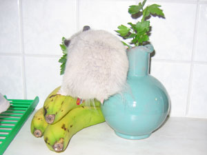 Dräktig hamster(?) Curly är så knubbig och otymplig att hon knappt tar sig upp på bananerna.